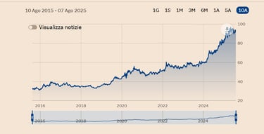(il grafico qui sotto e' tratto direttamente da Sito de IL SOLE 24 ORE , e riporta la crescita dell'ORO Fisico dal 2015 al 2025 . Quindi ultimi 10 anni ).